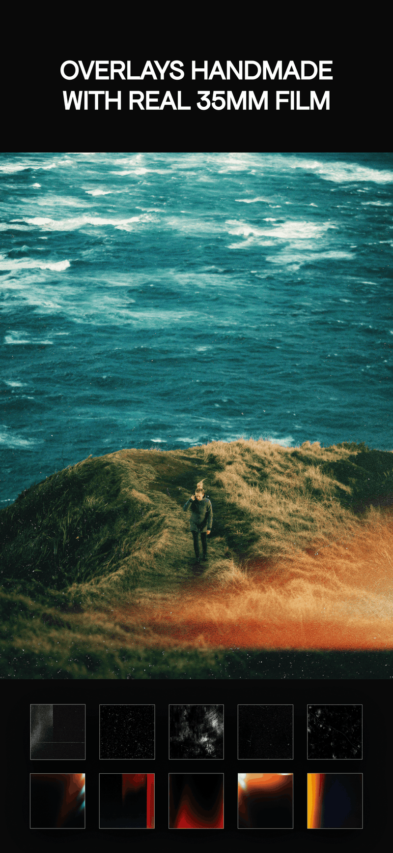 22 Dust textures, 20 Material textures like VHS / Paper, 48 Light textures like Film Leaks and Haze.