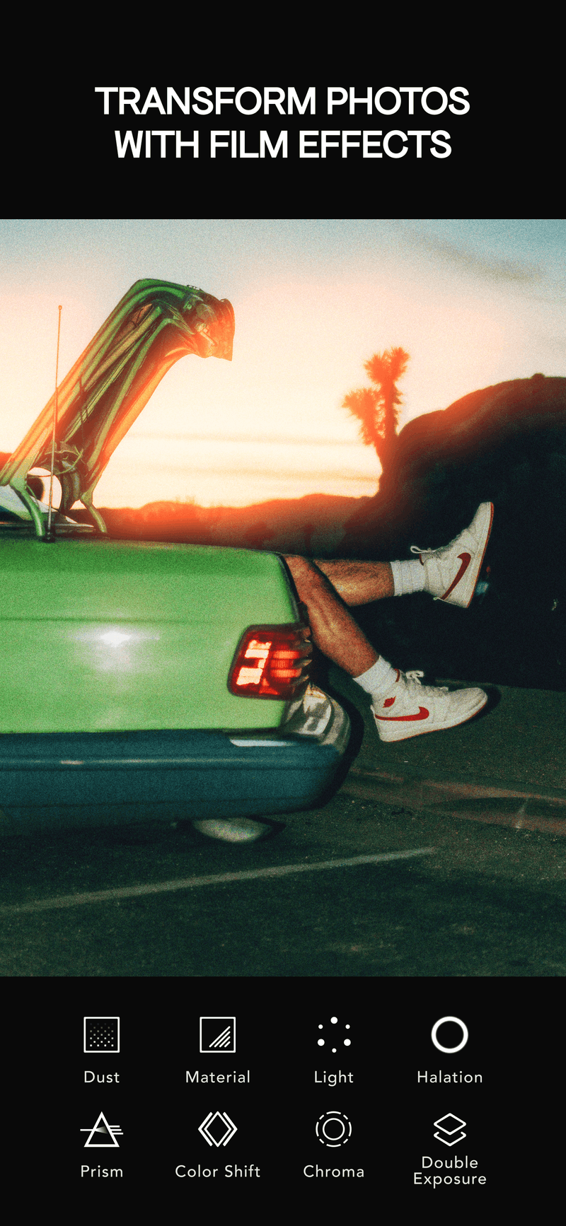 Apply film effects like Halation & Chroma, plus Color Shift, Prism and Double Exposure.